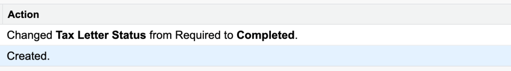 I created a validation rule that did not allow the status to be changed to “Required.” Here is the logic. The Follow_up__c field is the field that’s labeled “Tax Letter Status.”