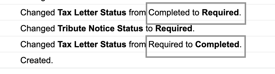 I created a validation rule that did not allow the status to be changed to “Required.” Here is the logic. The Follow_up__c field is the field that’s labeled “Tax Letter Status.”