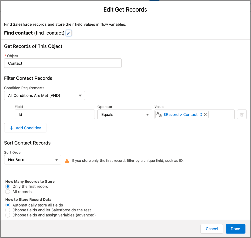 - First, in the Start node, find all users of a certain profile where a ContactId is present. This will avoid the system going through users without a contact and wasting precious, precious Salesforce juice.
