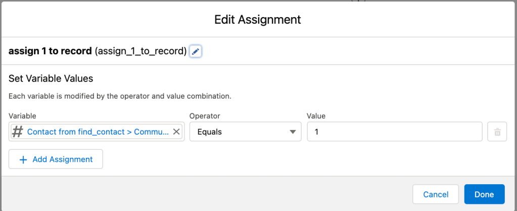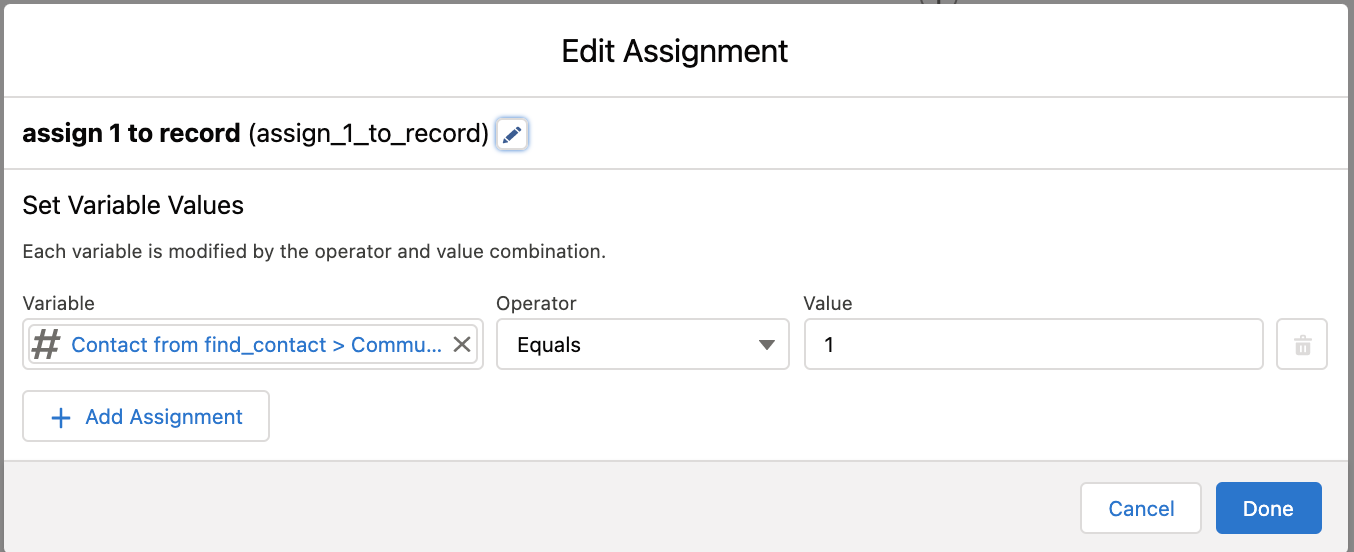 - Next, use Assign to populate the number 1 into the Number of Experience Cloud Users field you made in step 1.